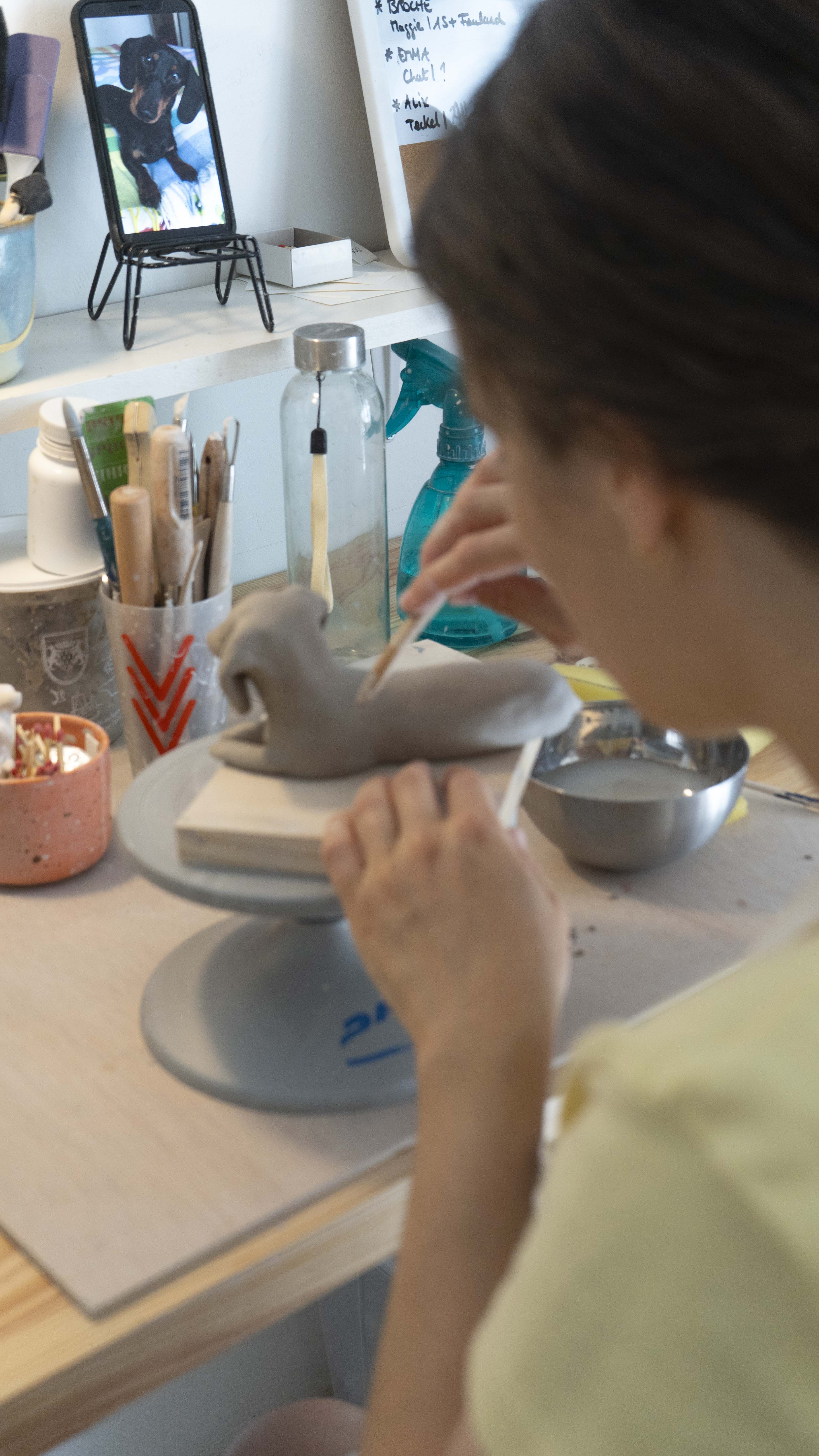À partir de vos photos, je modèle votre animal en céramique, puis je le peins à la main. Il doit ensuite sécher, être cuit une première fois à 980°C, émaillé, puis cuire une seconde cuisson à 1250°C. Votre sculpture est enfin prête à être envoyée ou remise en main propre à Marseille. Créer un Doggo est donc un processus minutieux qui demande du temps.